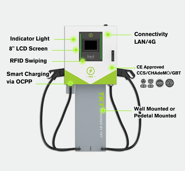 TKT wallbox DC charging station is the best choice for charging electric vehicles today. It is designed for fast charging in commercial and private places, such as retail and mall parking lots, fleet charging stations, highway services, workplaces, residences, etc.