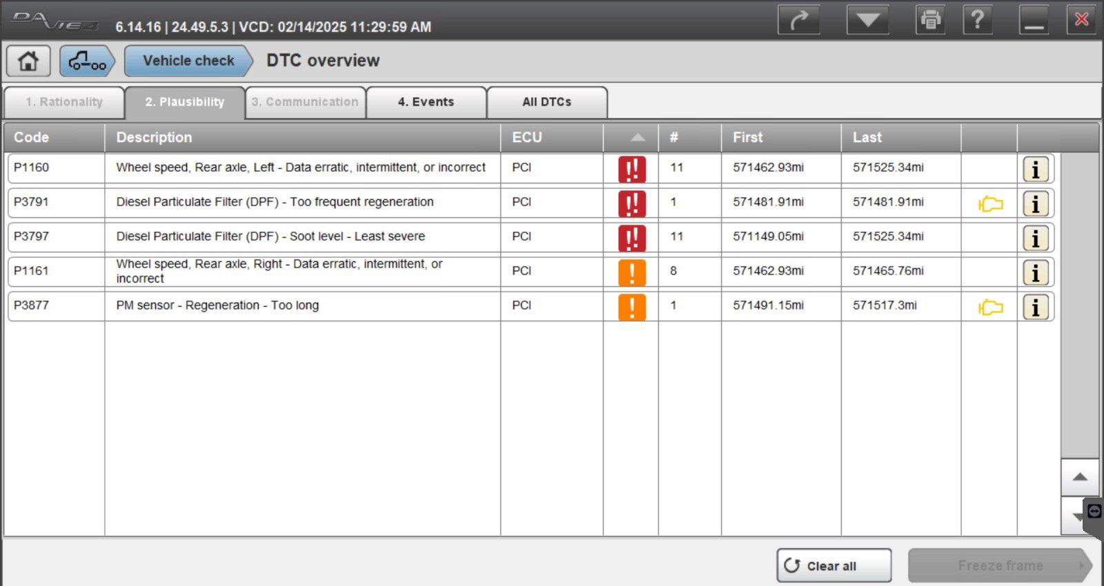 • Fault Code Reading & Clearing — Read active and inactive fault codes for engine and aftertreatment modules; view OEM codes and detailed DTC (diagnostic trouble code) reports.